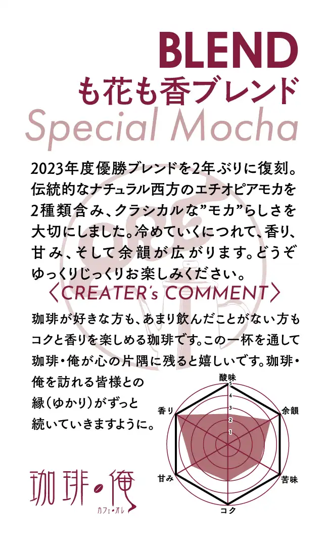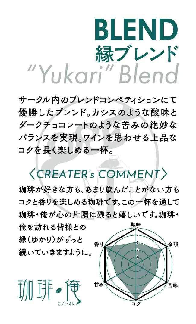 珈琲が好きな方も、あまり飲んだことがない方も、コクと香りを楽しめる珈琲です。このいっぱいを通して珈琲・俺が心の片隅に残ると嬉しいです。珈琲・俺を訪れる皆様との縁(ゆかり)がずっと続いていきますように。(製作者コメント)