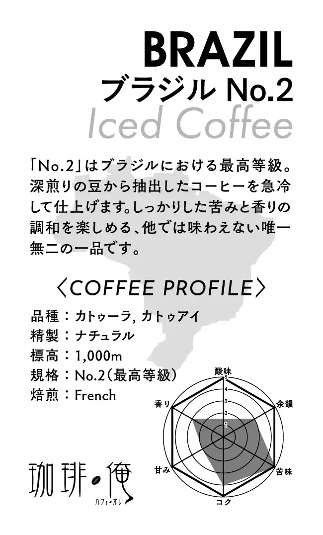 アイスコーヒーに使用しているのは、ブラジルで収穫される珈琲豆の最高等級、「ブラジル No.2」 です。