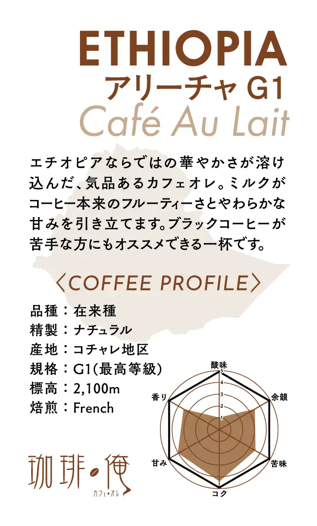 アイスカフェオレには、エチオピア・アリーチャ G1 を使用しています。