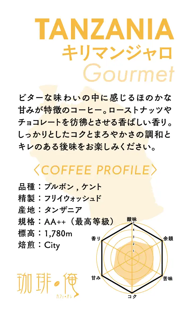 「キリマンジャロ=酸味」というイメージを持つ方も多いと思いますが、今回使用した豆は、ただ酸っぱいだけではなく、輪郭のはっきりした酸味が特徴です。