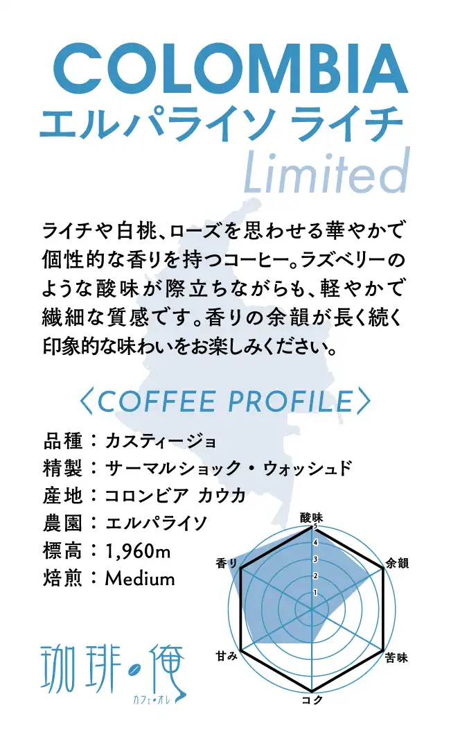エルパライソライチは、コロンビアのエルパライソ農園で収穫された珈琲豆を、サーマルショックウォッシュド製法 によって加工し、ライチの風味を際立たせた珈琲です。