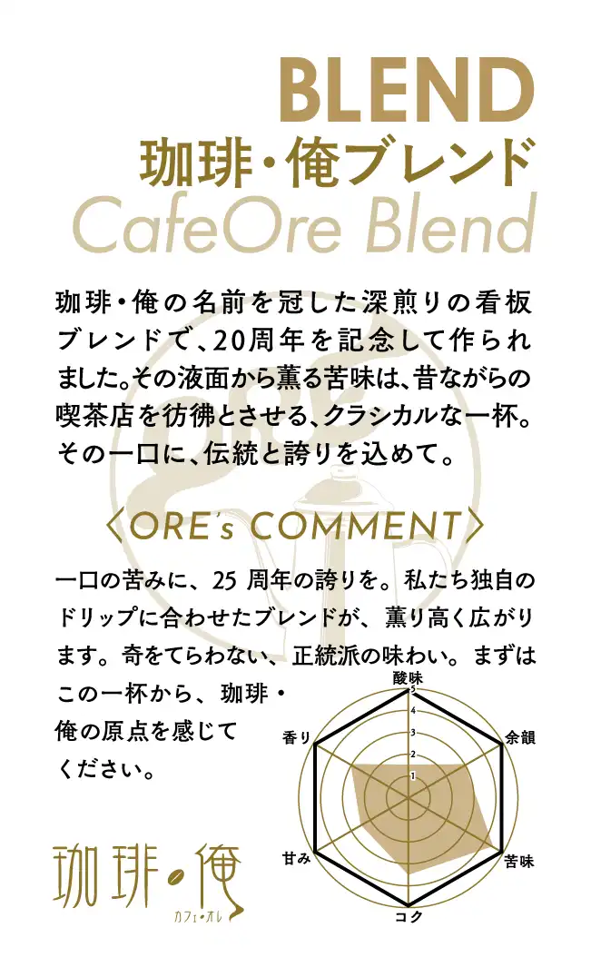 このブレンドは、珈琲・俺の20周年を記念して誕生し、以降長年にわたって受け継がれてきた、まさに 珈琲・俺の象徴 とも言える存在です。